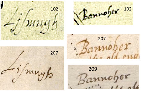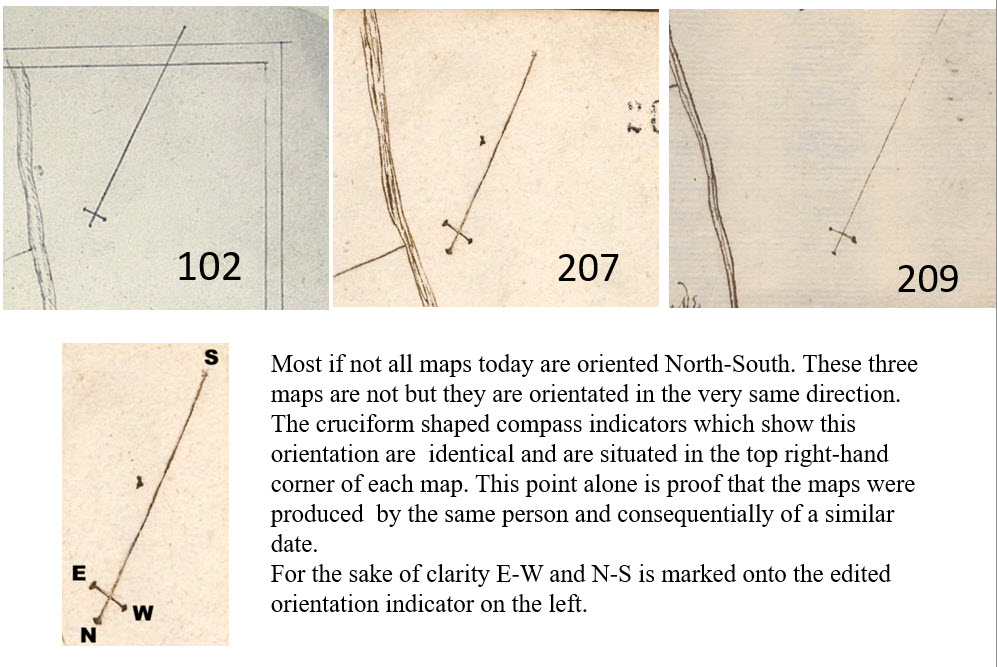 It will be shown that, regardless of the catalogue date difference, the handwriting on maps 102, 207 and 209 is by the same person and also that the three maps are based on the same original map.