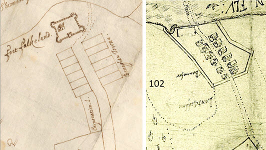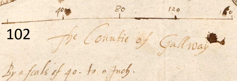 MPF 1/102 Date indication 1533-1603 (henceforth ‘102’). MPF 268 which contains 26 maps of Banagher and other areas in Offaly. De Renzy Ms SP46/91 page 207 Date indication 1630 (henceforth ‘207’). De Renzy Ms SP46/91 page 209 Date indication 1630 (henceforth ‘209’). Maps 207 and 209 are in very good condition. Map 102 has been affected by exposure. Reference is also made to and extracts used from several documents from De Rezny Ms SP46 90-93 which contain about 1000 pages.