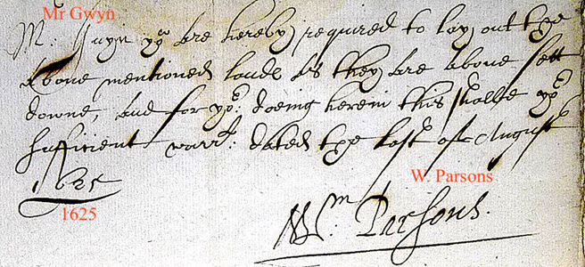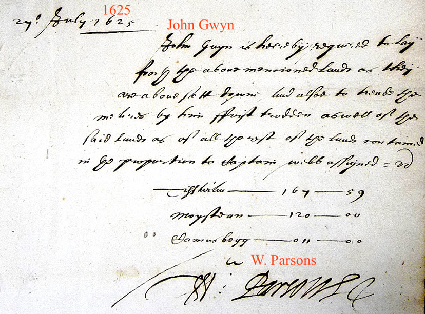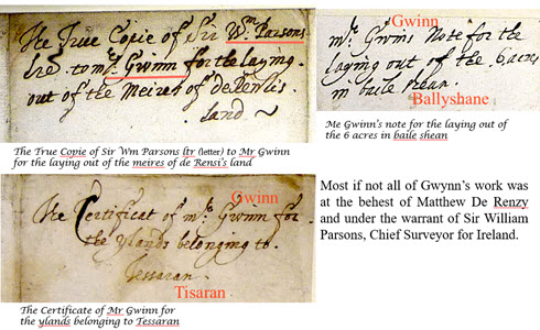 Not only does Gwynn’s name appear on several maps of West Offaly but letters between William Parsons, Surveyor-General from 1602 to 1641, and Mathew De Renzy have multiple references to Gwynn. These are mainly warrants from Parsons to Gwinn to survey and layout lands in and around Banagher, and in particular De Renzy’s own lands. Fortunately, most of the correspondence is dated and covers the period 1625-33.
