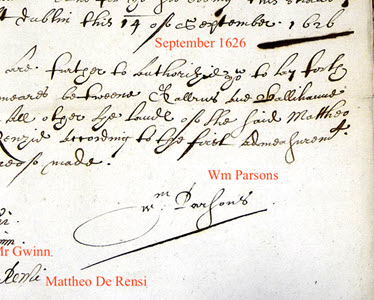 Many of these are by Matthew De Renzy himself relating to his Irish business affairs and in particular to his properties in West Offaly. Brian Mac Cuarta has transcribed perhaps 40% of these documents. The rest have, regrettably, never been interpreted or published and await further scholarly attention. Reference is also made to De Renzy maps MPF 268 which contains 26 maps of Banagher and other areas in Offaly. Matthew De Renzy & William Parsons.