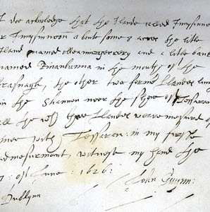 This extract from a very important document (yet to be published) dated October 1628 relates to a dispute between the burgessmen of Banagher Corporation and their sovereign, Sir Arthur Blundell. Part of the letter describes how the layout of the new town was constrained by floods.