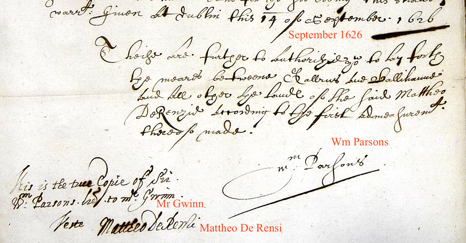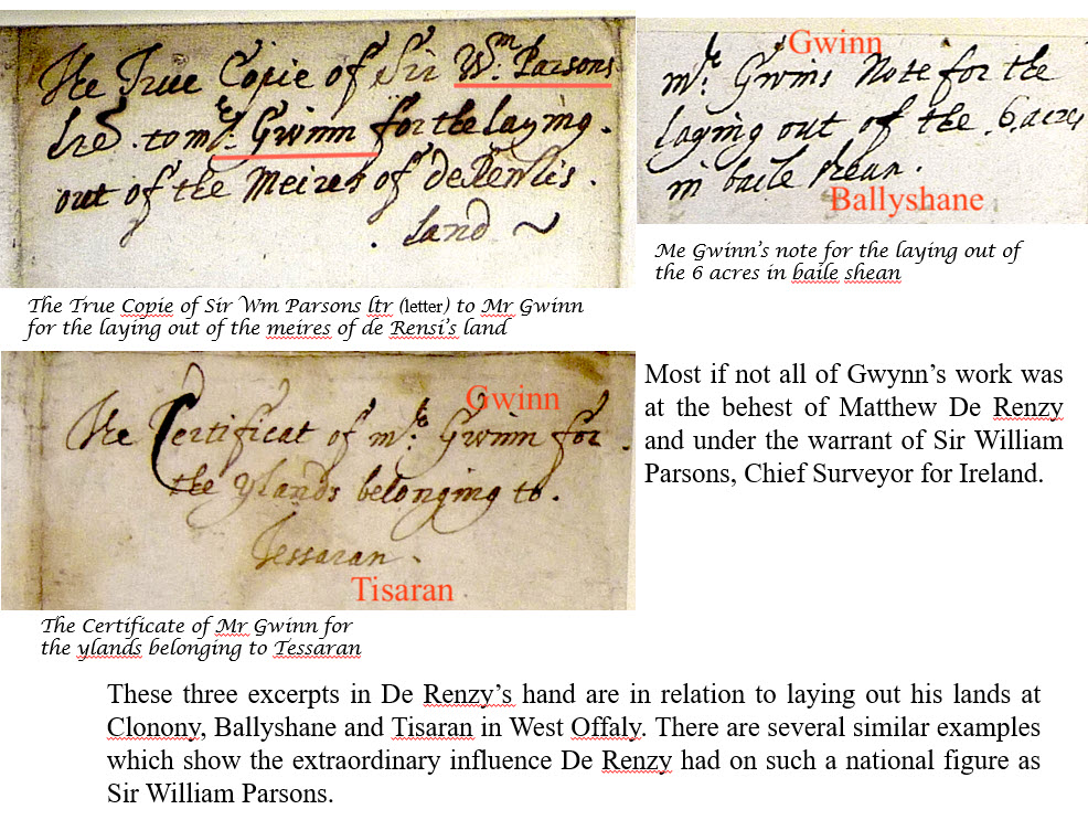 Many of these are by Matthew De Renzy himself relating to his Irish business affairs and in particular to his properties in West Offaly. Brian Mac Cuarta has transcribed perhaps 40% of these documents. The rest have, regrettably, never been interpreted or published and await further scholarly attention. Reference is also made to De Renzy maps MPF 268 which contains 26 maps of Banagher and other areas in Offaly. Matthew De Renzy & William Parsons.